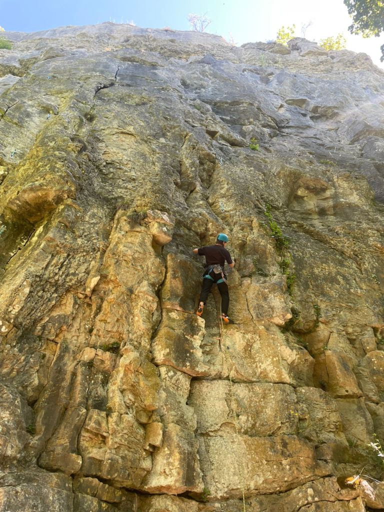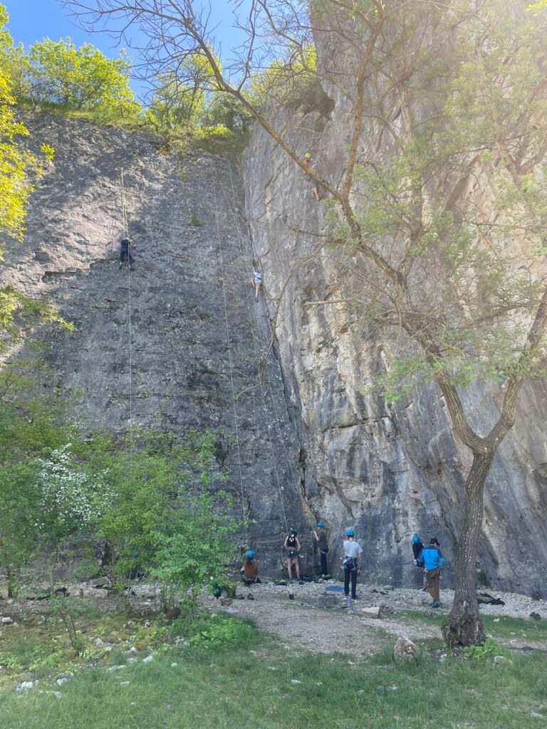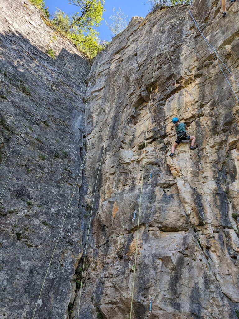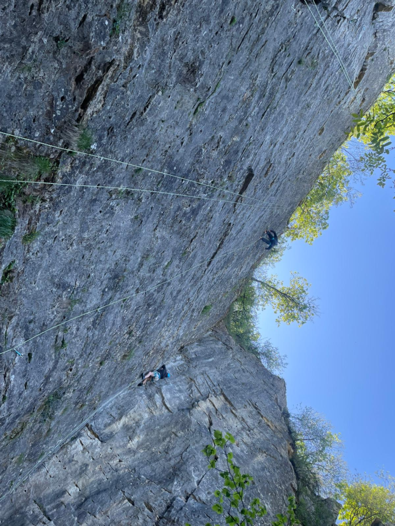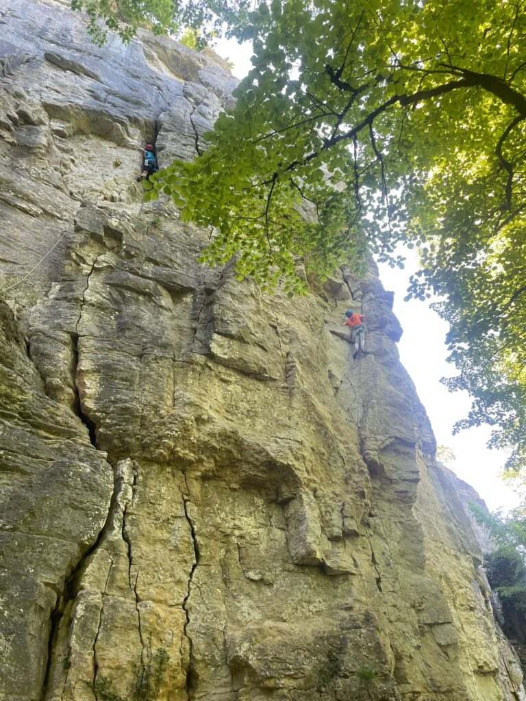 Un site calcaire situé dans une paisible forêt, avec une grande et belle falaise. Mathis et Adrien se sont particulièrement illustrés dans un 7a, où ils sont arrivés à une dégaine du relais après une belle bataille.